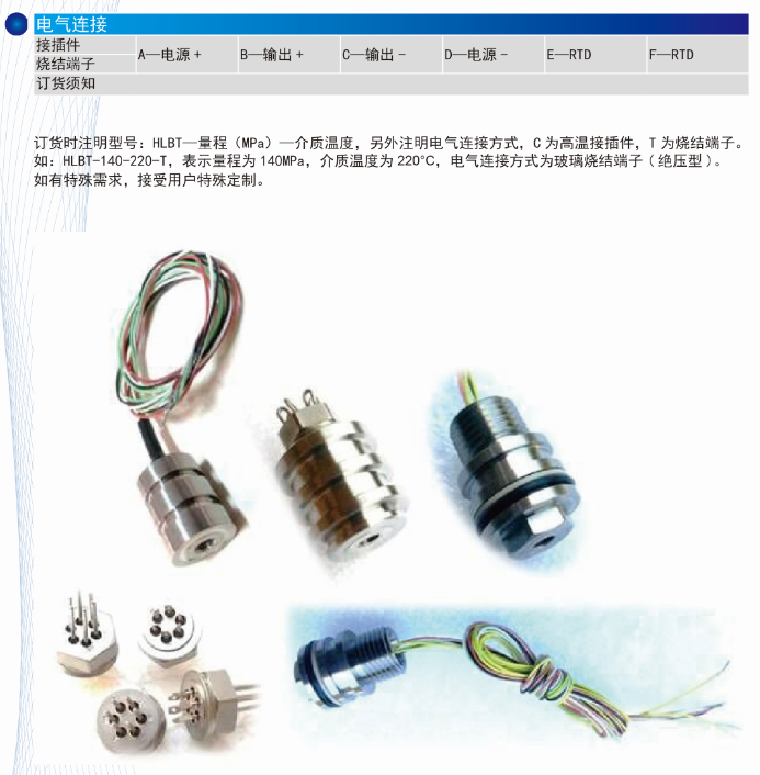HLBT壓力傳感器選用高強(qiáng)度、高彈性、耐腐蝕不銹鋼,采用濺射薄膜工藝技術(shù)將電橋電路直接沉積 在金屬感壓膜片上,在壓力作用下感壓膜片產(chǎn)生形變,從而使電橋的橋臂阻值產(chǎn)生差分變化,在外接電源的激勵(lì)下,輸出與介質(zhì)壓力成一定比例關(guān)系的電壓信號(hào)。由于工藝上的優(yōu)勢(shì),該傳感器不僅抗沖擊、 振動(dòng)、耐腐蝕,而且還解決了由于粘貼工藝而產(chǎn)生的遲滯、蠕變、漂移、老化、長(zhǎng)期不穩(wěn)定性等缺點(diǎn)。