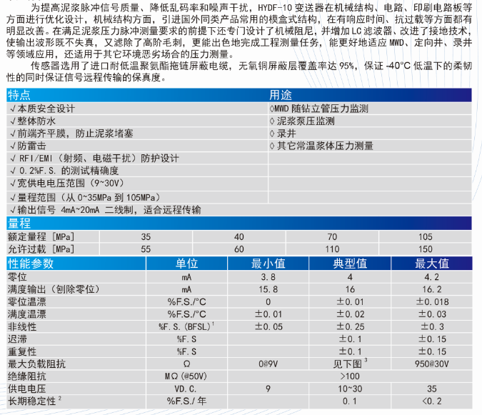 YHC-10 型泥漿壓力變送器是專門為油田鉆井工程中用于信號(hào)傳遞介質(zhì)——泥漿的壓力測(cè)量而專門設(shè)計(jì)的高可靠性、高穩(wěn)定性產(chǎn)品。