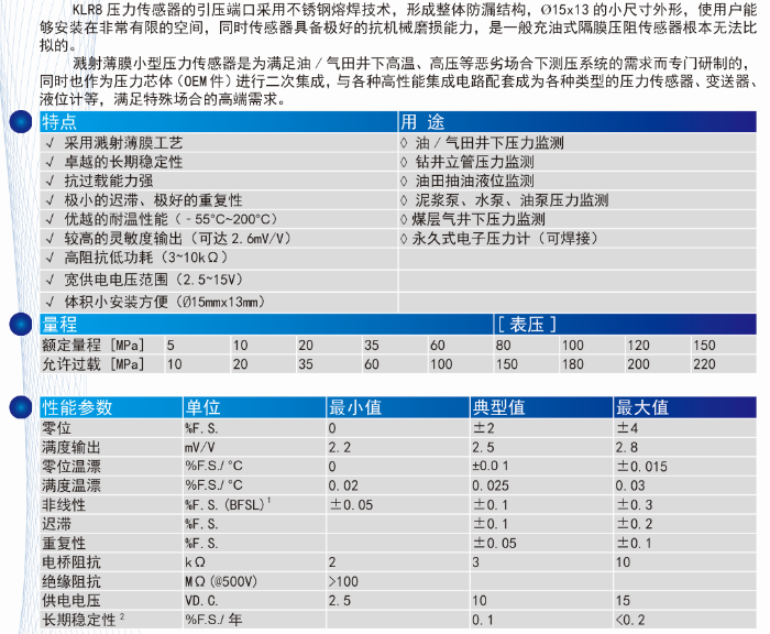 KLR8壓力傳感器取材于高強(qiáng)度、高彈 性、耐腐蝕不銹鋼,采用濺射薄膜工藝技術(shù)將電橋電路直接沉 積在金 屬感壓膜片上 ,在壓力作用下感壓膜片產(chǎn)生形變,從而使電橋的橋臂阻值產(chǎn)生差分變化,在外接電源的激勵(lì)下,輸出與介質(zhì)壓力成一定比例關(guān)系的電壓信號(hào)。由于工藝上的優(yōu)勢(shì) ,該傳感器不僅抗沖擊、 振動(dòng)、 耐腐蝕,而且還解決了由于粘貼工藝而產(chǎn)生的遲滯、蠕變、漂移、老化、長(zhǎng)期不穩(wěn)定性等缺點(diǎn)。