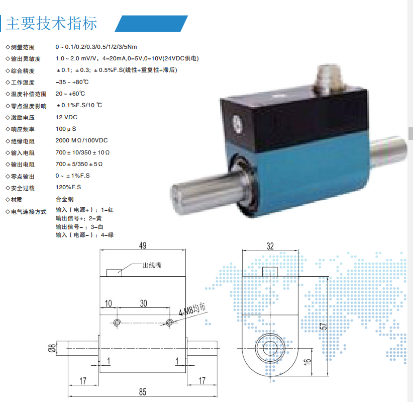 · 電阻應(yīng)變?yōu)槊舾性图呻娐窐?gòu)成的一體產(chǎn)品,通過(guò)電刷實(shí)現(xiàn)供電與信號(hào)輸出。