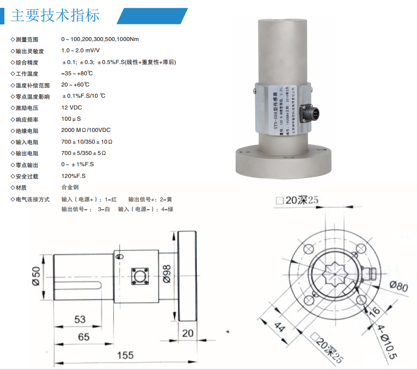 · 靜態(tài)扭矩測量。一端為鍵(或內(nèi)四方鍵)連接,一端為法蘭盤連接。